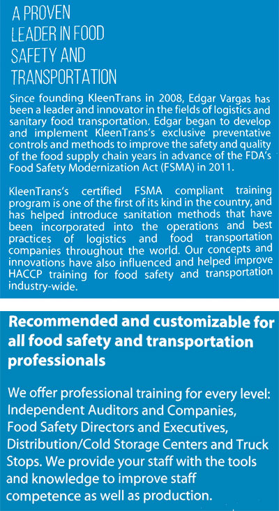 The FDA is catching up with the need for guidelines and standards that eliminate cross-contamination. KleenTrans is a pioneer in recognizing this need and in creating applicable systems. We have always felt that it is inevitable that services like ours will be become standard procedure in the future of food safety. As of April 2017, the FDA's Food Safety Modernization Act (FSMA) dictates that minimum food transportation sanitation requirements are met and properly documented. The services and the documentation we provide truck drivers will satisfy these FSMA requirements.
